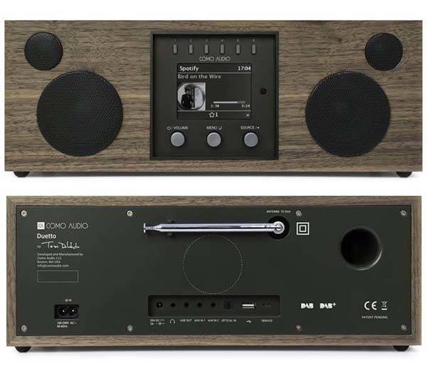 The Como Audio Duetto is a modern wireless speaker that comes complete with built-in support for internet Radio, Spotify Connect, FM radio, Wi-Fi, and Bluetooth. The system maintains high class aesthetics, flaunting physical knobs, round grilles and wooden cabinets.